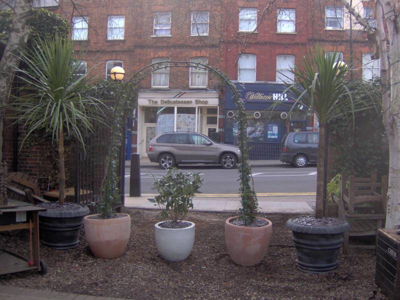 Mixed planting - large shrubs and climbers in pots