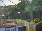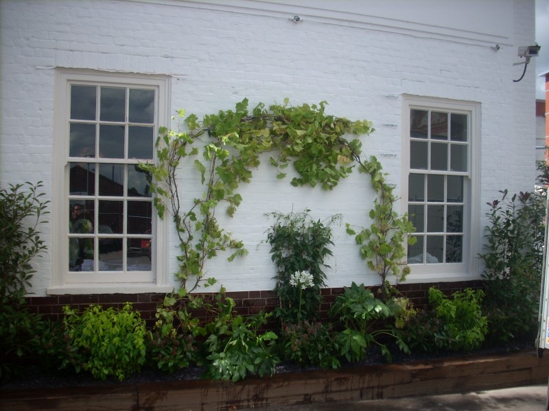 Railway sleeper bed with grape vine and mixed planting |