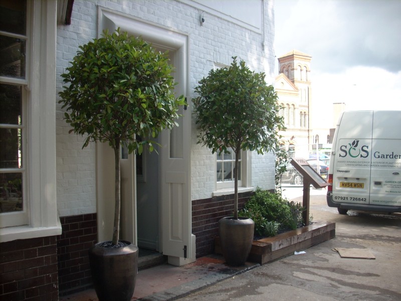 Summer window boxes and pyramid Bay Trees |